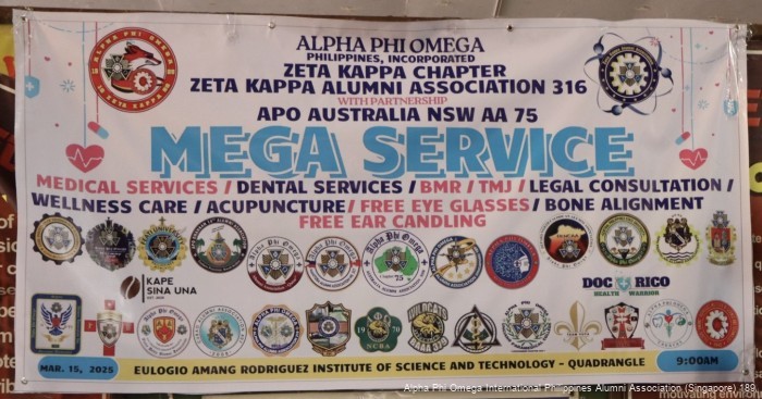 APOAAS 189 has participated on the Zeta Kappa AA Mega Service last 15 March 2025. The event was a huge success! A huge thank you to APO CARAVAN for the wellness, TEAM YOYA for the Dental, Bro. Dr. Christopher Pagaduan for the Medical, Kuya Bro. Alain and team for the free eye check up. Sis. Atty. Zen for the Legal, Sis. Rei for Pharmacy.